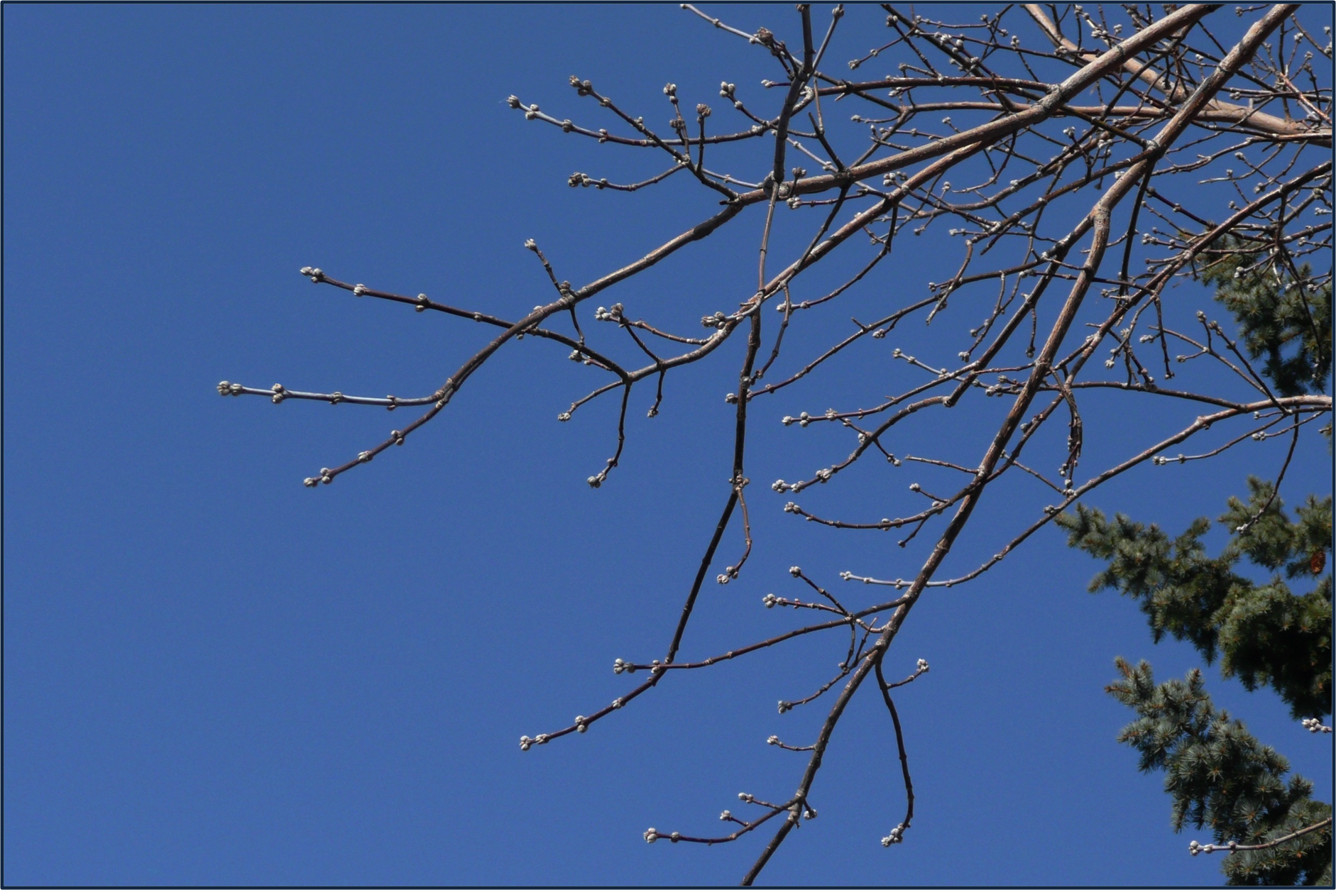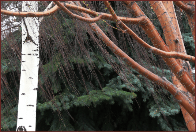 Textural contrast is another important consideration when planning your garden. Texture can be fine or coarse – during the growing season, fine texture generally refers to small leaves or flowers that are grouped closely together, and coarse texture would be large leaves or flowers spaced further apart. During the winter months though, we need to look at texture differently. Since most herbaceous perennials have little or no presence in the winter, and most deciduous trees and shrubs lose their foliage entirely, then it is the texture of their bark and branches we see. Spiraea and Potentilla, for example are fine textured – their branches are small, twiggy and tightly spaced. Syringa and Fraxinus (especially males) have much coarser texture – their branches are beefier, and more widely spaced. At any time of year too much tiny, tightly packed foliage, flowers or branches will end up looking busy, so punctuating with some coarse texture will create both emphasis and contrast.