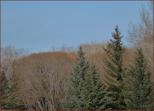 There is of course a limited palette available to us at this time of year – let’s see, gray, brown, grayish brown, brownish gray, sometimes white, some green, a bit of blue. Anything else? Well yes actually – take a look: