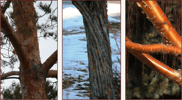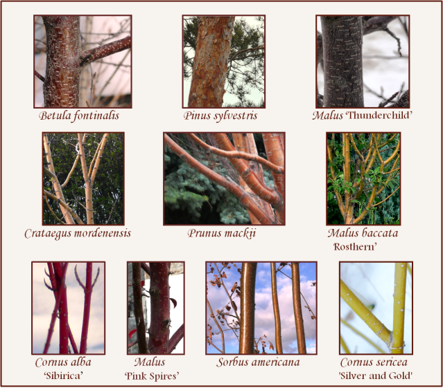 Compare the very different texture of the above three trees – the oddly flaking bark of Pinus sylvestris (left), the twisted striated bark of Crataegus mordenensis ‘Toba’(centre), and the shiny peeling bark of Prunus mackii (right). Photos: Sue Gaviller