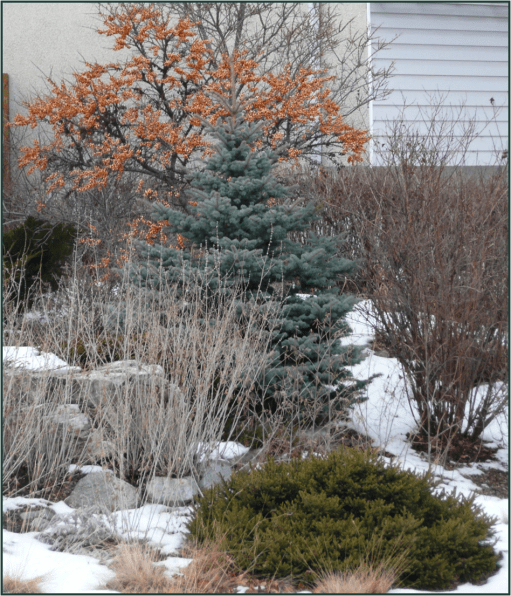 This attractive little Caragana arborescens ‘Walker’s Weeping’ has been nicely staged by underplanting with a Juniperus sabina cultivar and framing with 2 Juniperus scopulorum specimens – likely Wichita Blue. Photo: Sue Gaviller