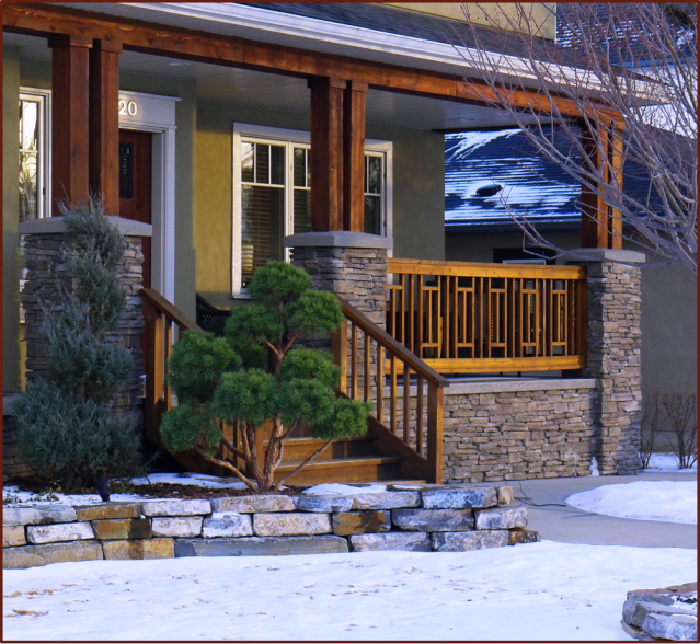The beautiful bronze bark of this Prunus mackii picks up the warm hues of the wood and stone on the house. These same colours are seen again in the boulder in the foreground. Photo: Pat Gaviller