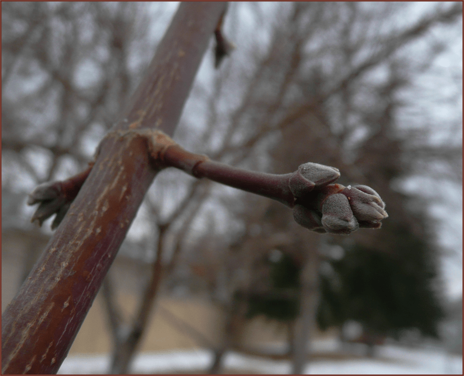 Acer negundo ‘Sensation’, a cultivar of the Manitoba maple, is a lovely tree with yearlong interest. Though debatably hardy here, this specimen has been growing in a protected spot in Northwest Calgary for many years. Viewed up close Manitoba maple buds are soft and fuzzy – reminiscent of puppy paws or bunny feet.