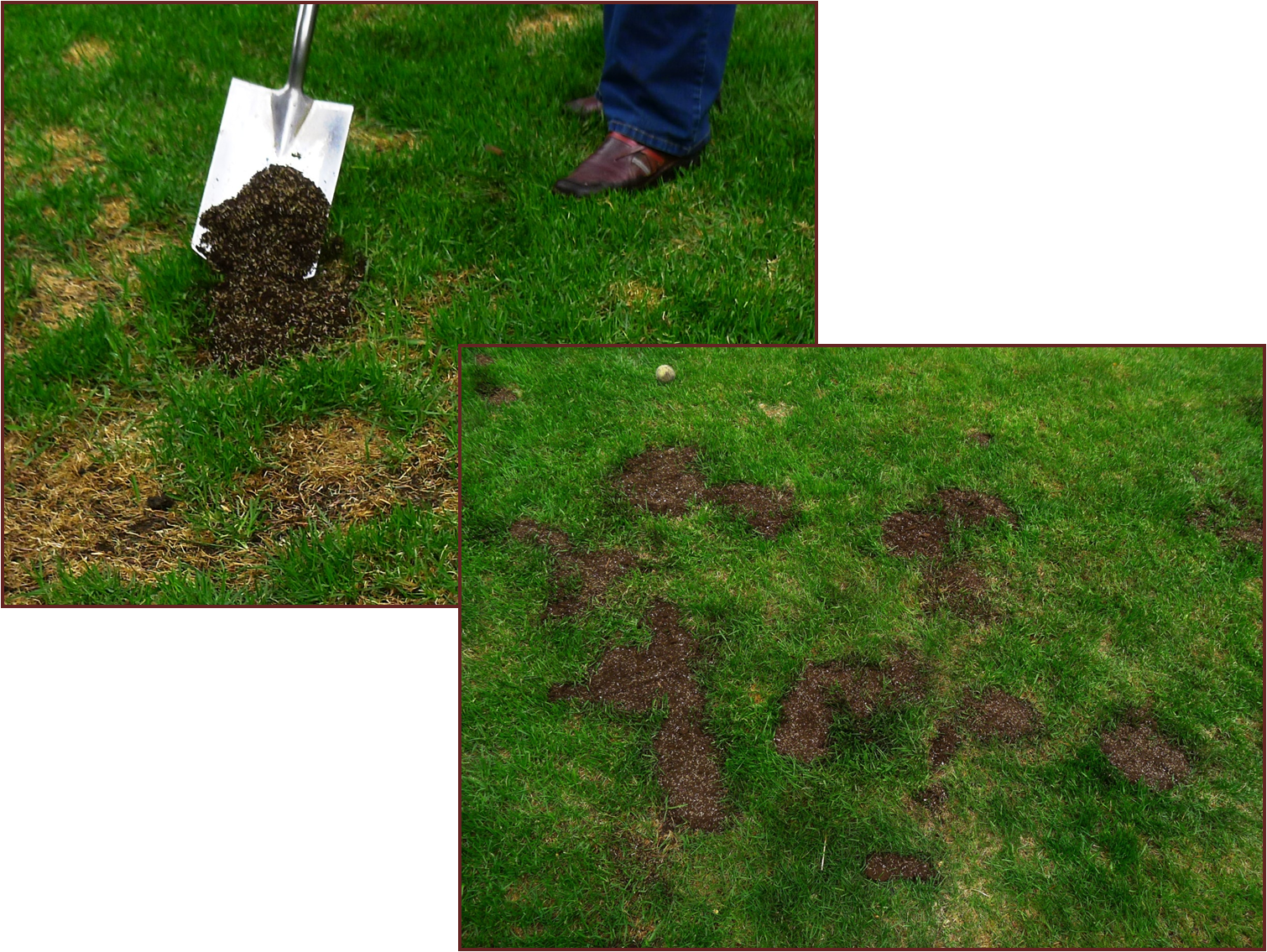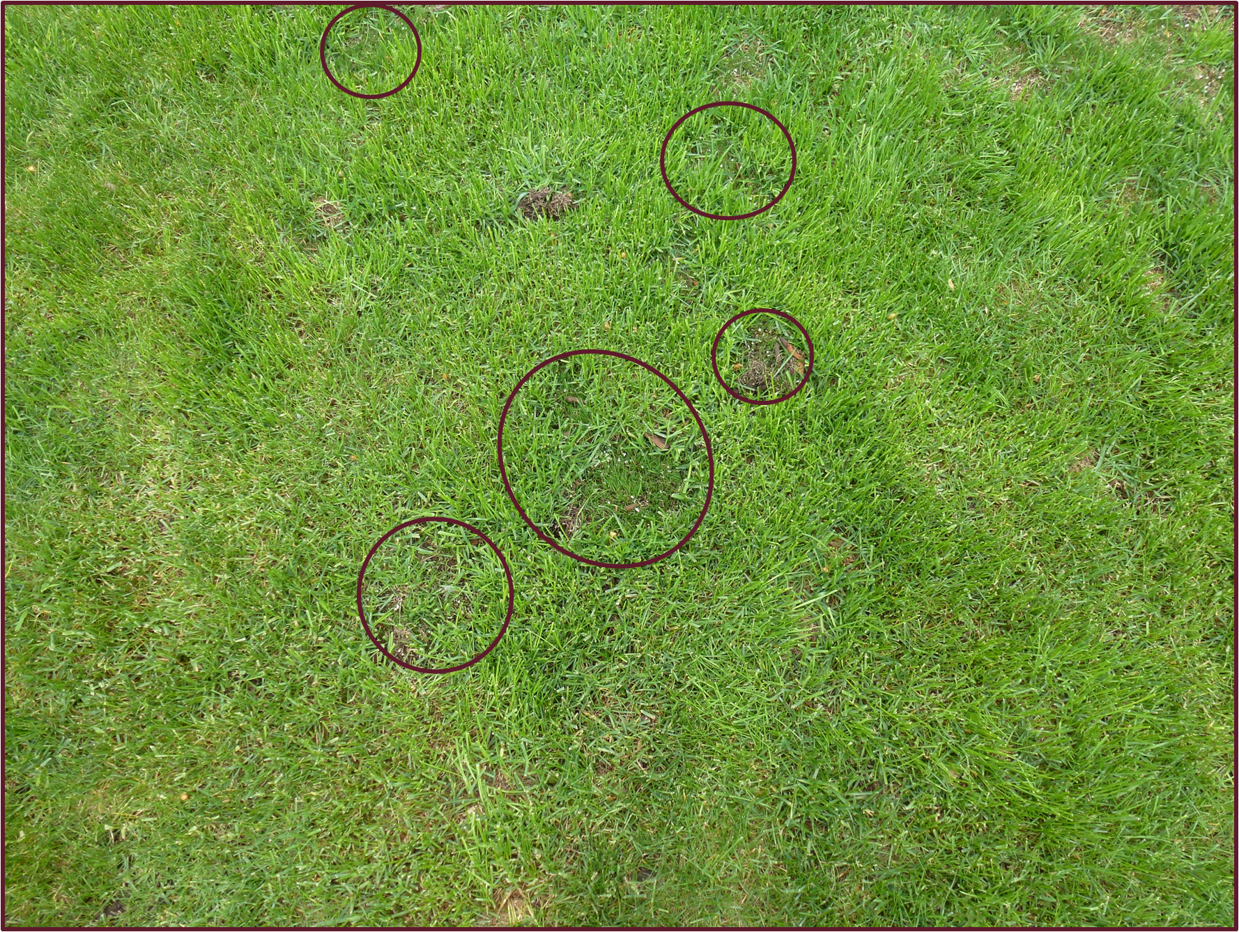 - Reseed the area – I mix loam and grass seed 2 to 1 and apply the mixture to each spot. Seed germinates within 7 to 10 days. I repeat this process whenever there are a number of spots.