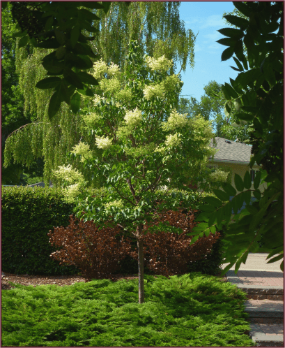 Two Physocarpus opulifolius ‘Summer Wine’ flank Syringa reticulata, creating a symmetrical backdrop. Photo: Sue Gaviller